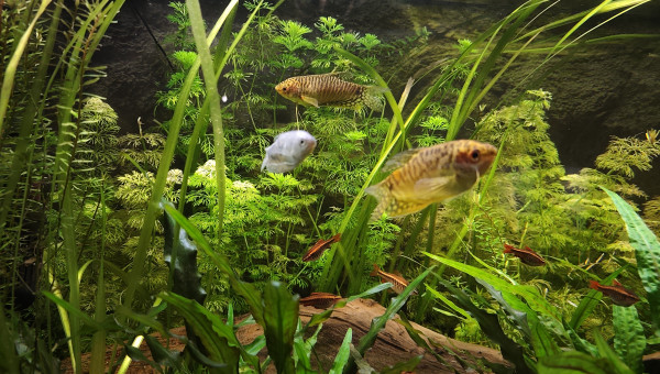 Le couple de gouramis dorés du 300L a emménagé dans ce bac. Clairement, c'est le jour et la nuit côté comportement. Dans le 300L, le mâle chassait la femelle méchamment et passait le reste de son temps posé sur le sol à l'abri d'une racine. Il ne bougeait que pour venir manger. La femelle vivait sa vie hors de sa vue. Quant aux deux Sewellias, ils étaient peu actifs. Dans ce bac-ci, le mâle gourami est visible en permanence, à tous les niveaux du bac et s'il lui arrive encore de courser la femelle, il est bien moins vindicatif. Elle le rejoint d'ailleurs assez régulièrement sans qu'il la chasse. Tous les deux ont inspecté de près les Adolfoi avant de décider qu'ils n'y avaient rien à craindre d'eux.