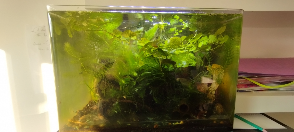 Aquarium spécifique Caridina, sol technique et eau osmosée reminéralisée, plantes épiphytes et mousses sur racines.