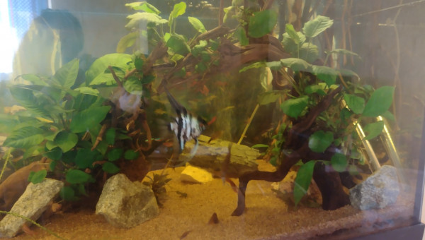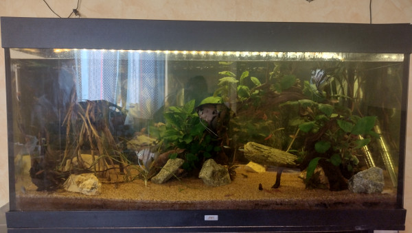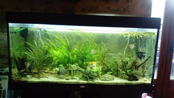 Pour cause d'une fuite on a dù vider l'aquarium et donc on en a profité pour lui refaire une beauté, mais aussi d'acceuilir nos deux femelles scalaire. nous avons egalement changé l'éclairage de nos néons par des led moin forte mais plus adapté pour notre petite scalaire aveugle d'un oeil.