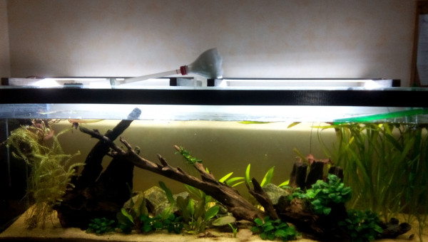Retour à la lumière après 5 jours de pénombre suite à l'apparition d'algues vertes sur les feuilles des ludwigias. Riposte immédiate : Diminution de l'apport en nourriture, baisse de l'éclairage de 5/10 à 2/10 sur la rampe droite et 3/10 sur la rampe gauche, nettoyage du filtre et des tuyaux.