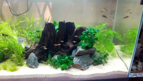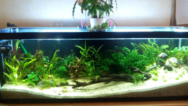 Je laisse vivre le bac à son rythme sans trop interférer. Tous les poissons semblent à l'aise et les gabonnaises se montrent volontiers depuis 1 semaine. Je vois les deux bleues et la brune tous les soirs. En revanche, je n'ai pas vu la rose-orangé depuis plus d'un mois, il y a beaucoup de plantes et pas mal de place sous les grosses racines. Du coup, je ne m'inquiète pas. La population de poissons est nourries aux paillettes, artemias surgelées, vers de vase surgelés, courgettes, pastilles de fond. Les algues sont peu présentes et je retire les plumeaux à chaque intervention dans le bac. Les plantes sont boostées au CO² artisanal (gelée/levure). Changements d'eau 30 % toutes les 2 semaines, car je compense l'évaporation tous les 2-3 jours avec 5L d'eau de conduite. La ponte d'ancistrus a foiré, le mâle a laissé le nid au bout de 3-4 jours et se montre beaucoup (faisait-il juste le ménage en prévision de ?). Pour le moment, il recharge ses batteries. Les 2 femelles corys sont pleines jusqu'aux barbillons et les pontes se succèdent. 4 alevins visibles dont un minuscule. Les Apistogrammas Hongsloi arrivés il y a une semaine commencent déjà à fouiner dans les creux et recoins , je vais leur rajouter de quoi se faire un petit nid d'amour et supprimer une ou deux anubias qui prolifèrent littéralement. Elles sont luxuriantes et je vais essayer de les faire fleurir, mais comment ? Les Echinodorus Osiris ont considérablement pris en hauteur et les Vesuvius ont lancés plusieurs stolons dans toutes les directions, Je vais pouvoir replanter une bonne dizaine de jeunes pieds tout neufs !