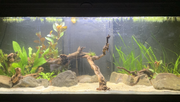 Bac mis en eau le 22 février Voici mon bac de 120l très bien planté qui a pour projet de maintenir un couple de Ramirezi et un groupe d’otocinclus