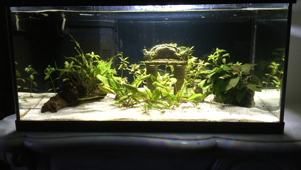 Bac 54 litres sans co2 Sable de loire sans sol nutritif, roche, racine et deco kitch (pour faire plaisir a ma fille). Plantes : hygrophilia polysperma et rosaewig, anubia, fougere de java, crytocorine. Population a venir : amandae, davidi, clithon.