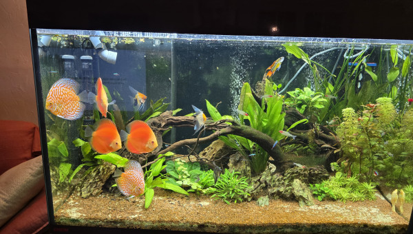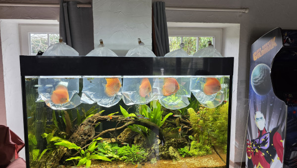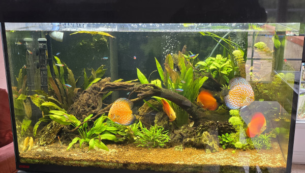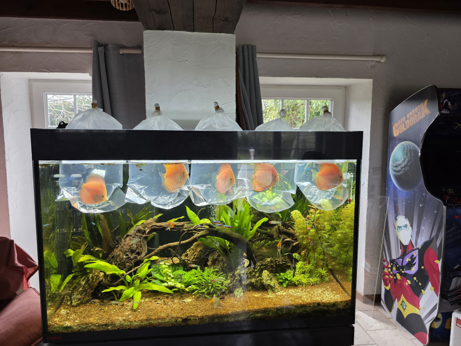 Bac discus amazonien. A l'origine cest un Eheim marin que j'ai transformé en amazonien discus . Après quelques années d'arrêt j'ai relancé un bac de discus ce poisson le fascine tantvpar ses couleurs que par son comportement .