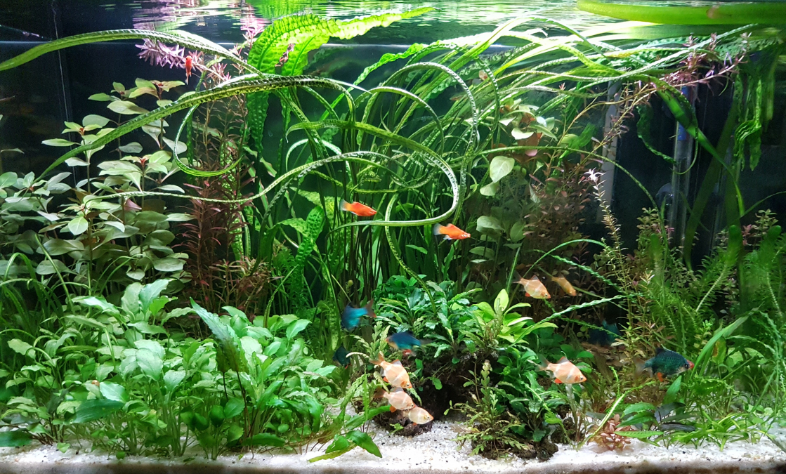 Parallèlement à ma passion pour les très attachants poissons rouges, j'avais envie de créer un bac "plaisir des yeux", pas trop petit, pas trop gros, très planté, animé de poissons de banc, de crevettes, et de kuhlis que j'affectionne depuis longtemps.