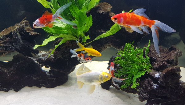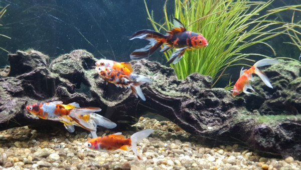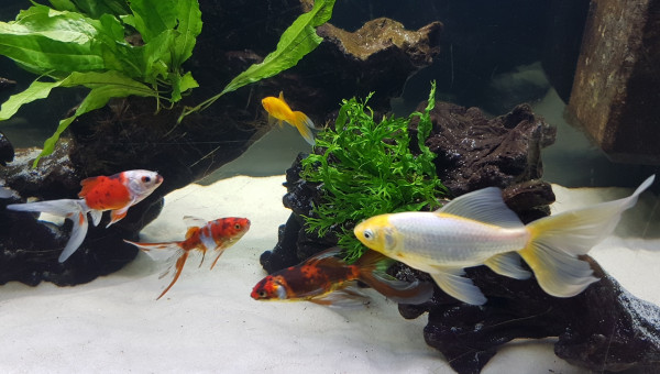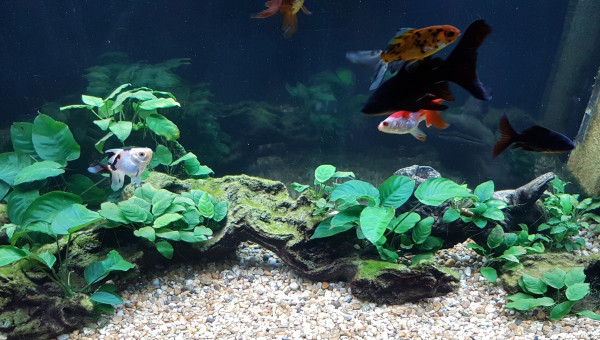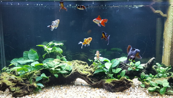 Bac volontairement très simple Gros graviers de rivière sur 3 cm Racines mopani Anubias
