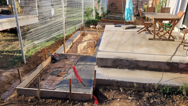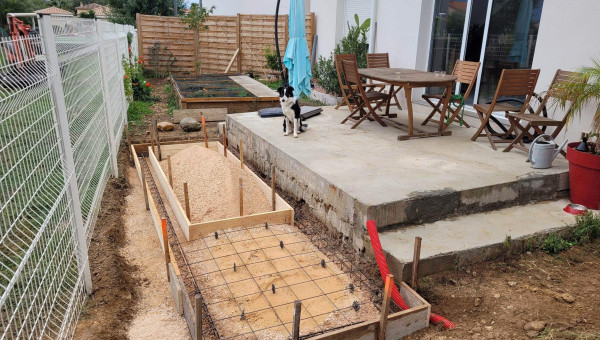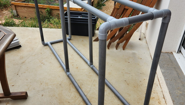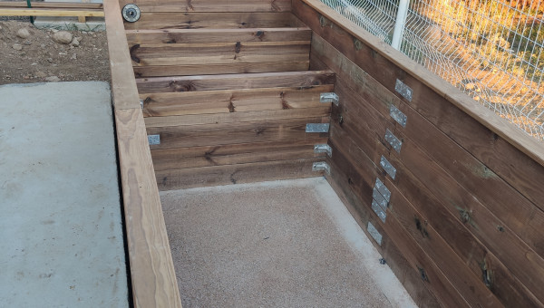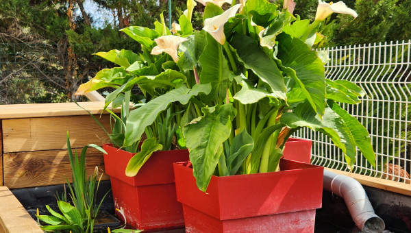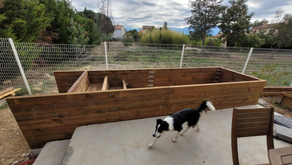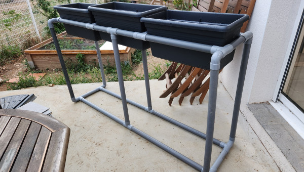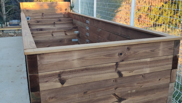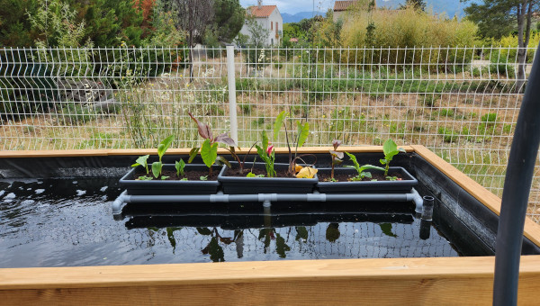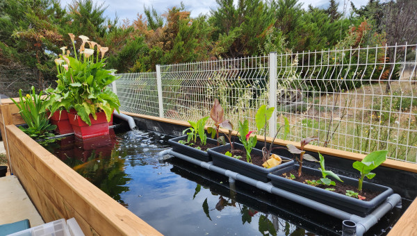 Aquarium hors-sol de 4m de long et 1,25 de large, 1 m de hauteur, avec marches où disposer les plantes et local technique.
