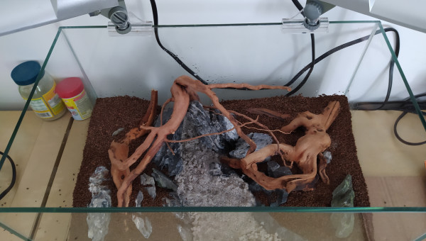 Pas de CO2 allumé, mon adaptateur n'a pas le bon. Filetage ... ? J'en reçois un mercredi. 3 jours sans CO2 ça ira. J'ai finalement mis un "Bosquet" comme j'avais en idée principale. Le bonsaï était une super idée mais galère à construire et le prix de la dissidents fontanus m'a un peu découragé aussi ?.