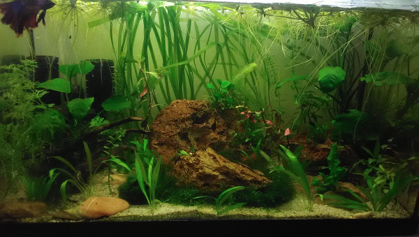Bac de 55L brut habité par un Betta splendens ainsi que des crevette déclassée sauvages.