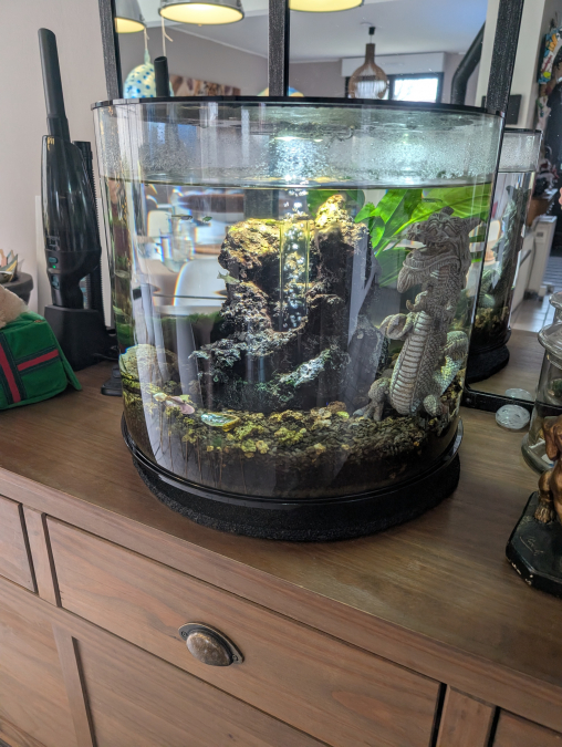 Avec pompe filtration d'origine Biorb cheminée centrale, chauffe eau réglé à 24° et éclairage de 7h à 11h et de 15h à 19h