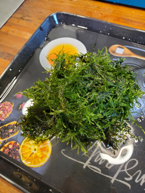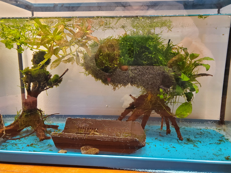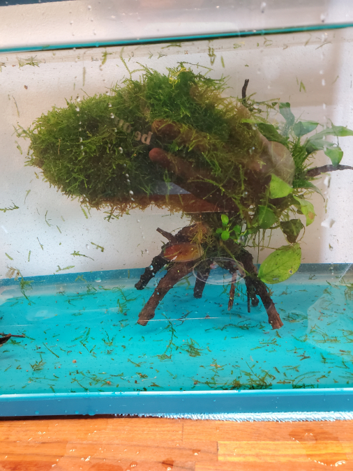 Après la réintroduction des femelles pleines et alevins dans leurs aquariums, j'ai pu mettre le bac en chauffe pour éliminer les vers blancs (3jours à 29/30degres). Nettoyage du bac pour bien assainir Et grosse taille de l'arbre en X-moss pour alléger la touffe et récupérer de la mousse pour une autre creation