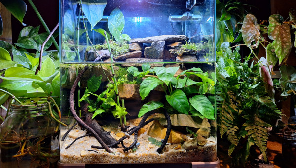 La filtration est assurée par une petite pompe qui monte l'eau de la cascade. Il y a un tas de sachets de pouzzolane derrière les pierres. Plus de volume moins de poids et filtration. Pour l'instant les mousses du fond du jardin se maintiennent. La prêle hyemale, difficile à dire mais elle n'a pas crevé. La bouture de pothos semble se plaire. Je dois préparer d'autres boutures. Pour mémoire, ce bac est en phase "laboratoire" paludarium. J'ai introduit des ostracodes en ajoutant de l'eau d'un autre bac. J'ai aussi ajouté deux ou trois planorbes. Les racines aériennes de la monstera deliciosa vont bientôt atteindre l'eau