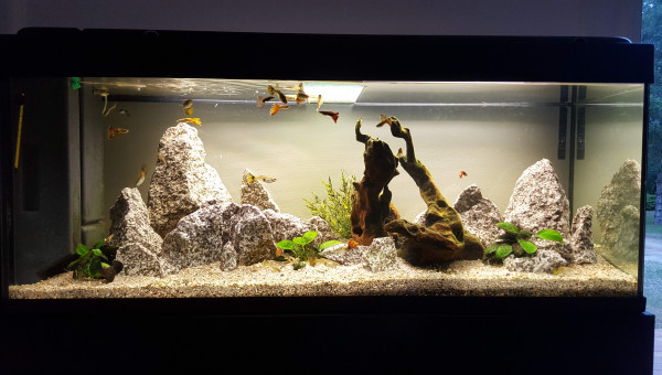 Ayant récupéré l'aquarium chez mon père, j'ai gardé une grande partie de l'aquarium initiale. C'est à dire : Le substrat Le système de filtration pompe chauffage La racine Un néon sur 2. Population de Guppy dégénérés par consanguinités. Pour mes changements/rajout : Des roches granitiques de chez mon Beau-frère en Deux-Sèvres Un néon Led rouge Quelques plantes en plus : Valisneria / Cryptocorine / Fougère... Et des Platys