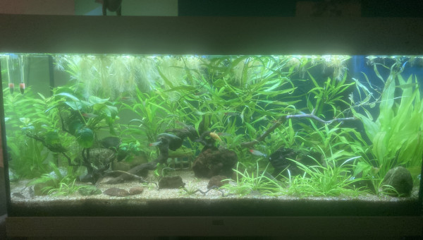 Aquarium juwel 180 avec néon et filtre d’origine. Racines, galets et bien planté. Il héberge 10 nez rouges, 7 corydoras trilineatus, 1 ancistrus et 5 endler, physes, melanoides et planorbes