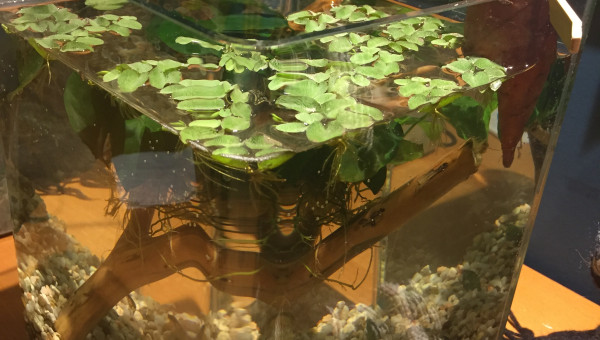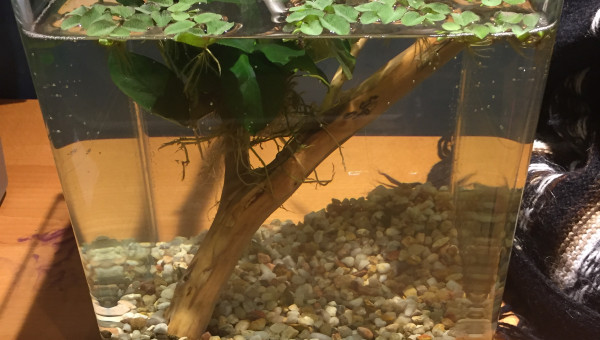 Nano avec gravier, branche morte trouvé , anubia et lentilles Plus une patate douce Avec un futur ajout de mousse de java Pour un combattant et planorbes