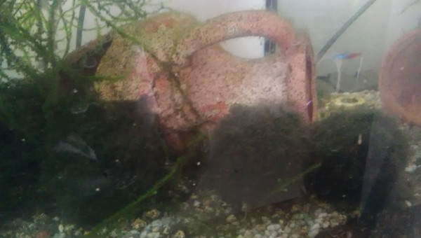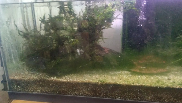Renouvellement d'un tiers de l'eau avec de l'eau du robinet. Rinçage du filtre. Lèche vitre retrouvé. => Eau extrêmement trouble, suite au rinçage du filtre très encrassé.