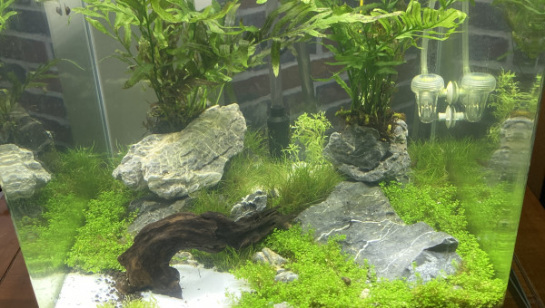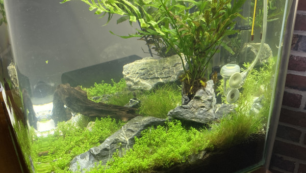 Nouvelle configuration du Nano Dennerlé de 60L, avec deux bonsaïs et deux types de mousse (Taxiphyllum Barbieri , Christmas Moss pour Wabi-Kusa) Le bonsaï de droite est collé à une ardoise, elle même recouverte de Riccia Fluitans. Un regret, l'erreur d'intégration de l'Hemianthus Callitrichoides (collée sur un des ardoises au lieu de l'intégrée dans le substrat). Réutilisation des plantes d'arrières plan et ajout de laitues d'eau (grâce à un don sur notre site FishFish. Enfin, le substrat est dorénavant recouvrir de sable pour crevettes (mais si mon Combattant ne me permet pas d'en ajouter).