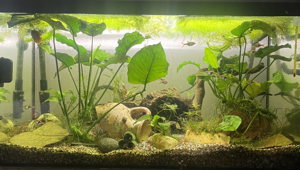 Aquarium communautaire en eau douce. Volume brut d’environ 105 L (75×35×40 cm). Volume net : 80 L. Mis en eau le 1 janvier 2015. Points notables : pierres, racines. Propriétaire basé à Gaillac.