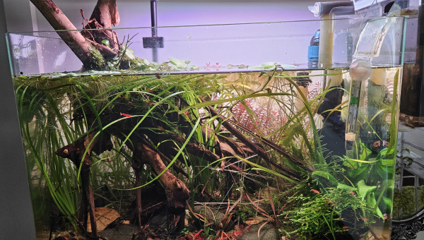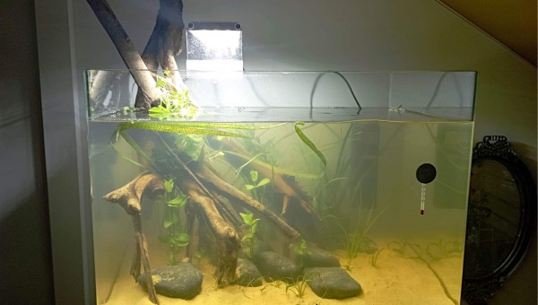 Viens d’être mis en eau. Lorsque l’eau sera claire je rajouterais les feuilles mortes, les coques et le tanin ? j’ai hâte que les plantes poussent et je risque d’encore en rajouter …