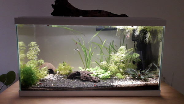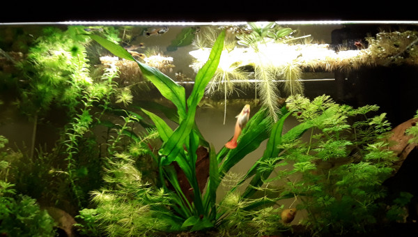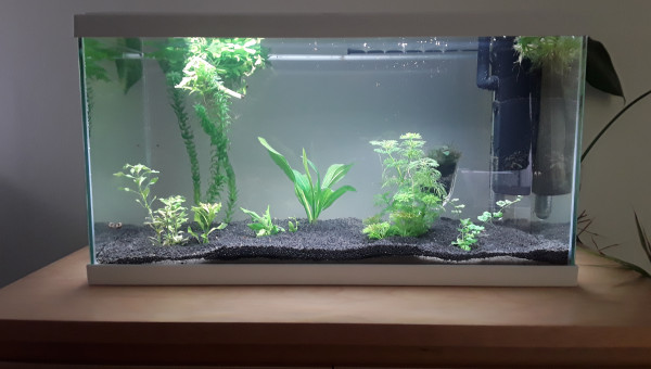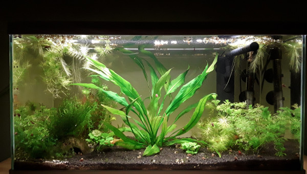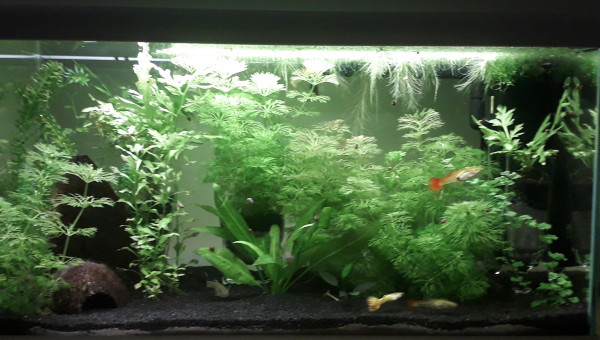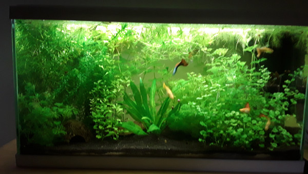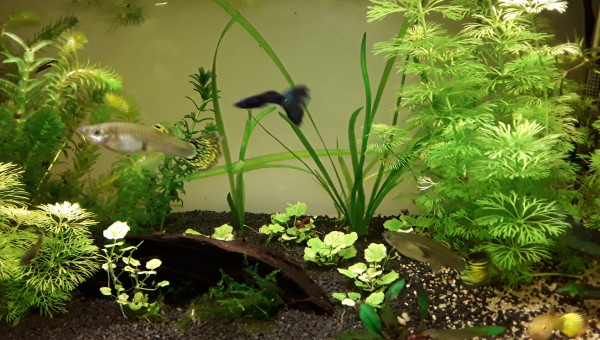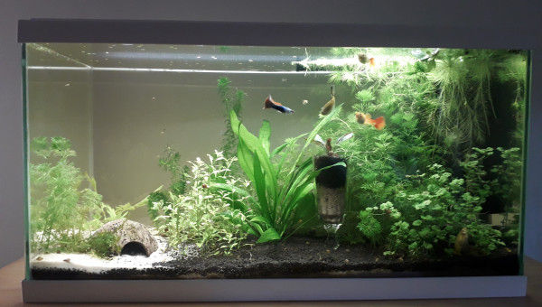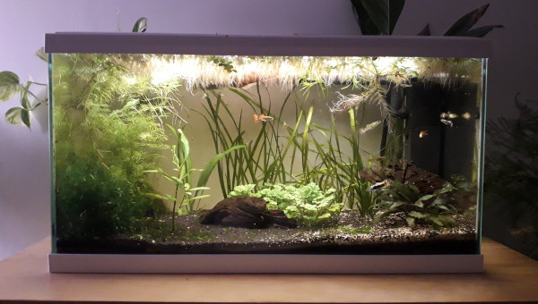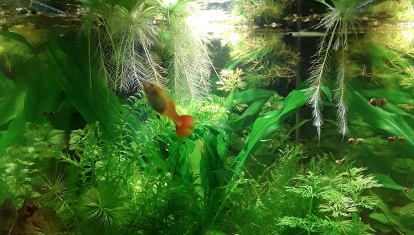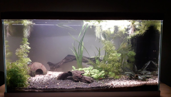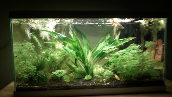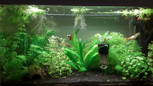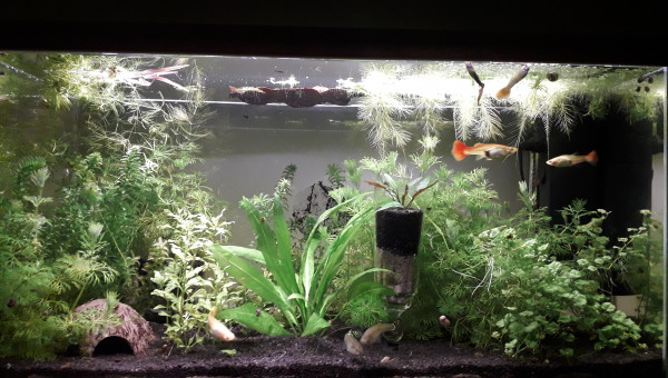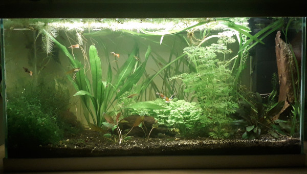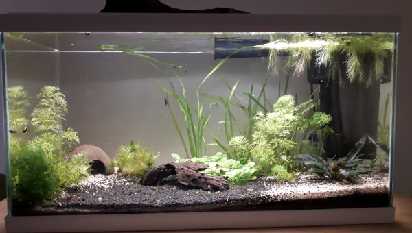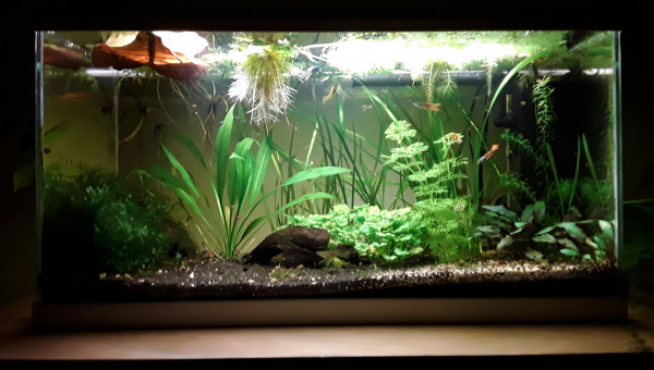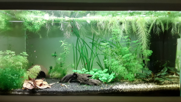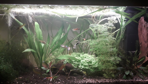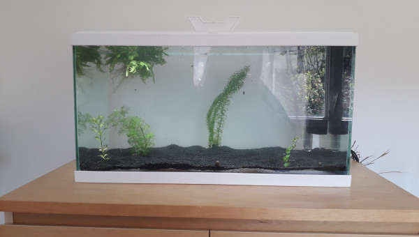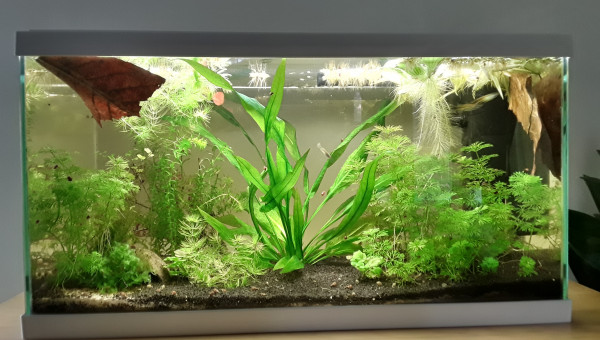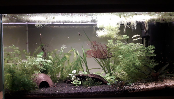 Suite à une invasion d'hydres (dont je n'arrive pas à savoir comment elles sont arrivées là... ) j'ai dû virer mon echinodorus il y a 3 jours. Une de mes guppynettes (rouge) est aussi arrivée au bout de sa vie. Un nettoyage minutieux, un gros changement d'eau et quelques petites plantations plus tard, je croise les doigts pour les hydres, je n en détecte plus depuis deux jours :)