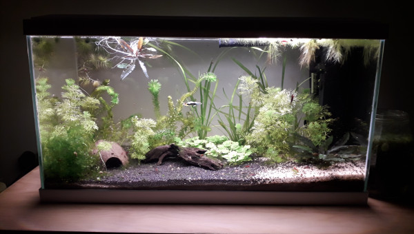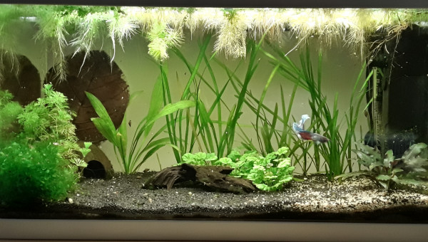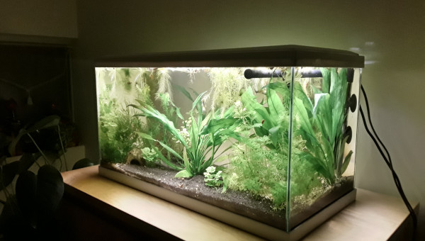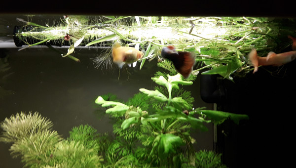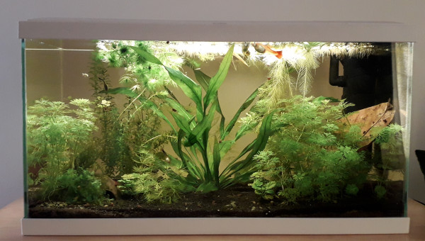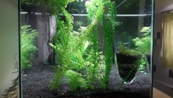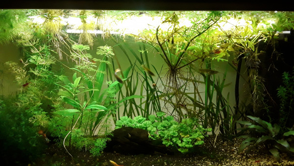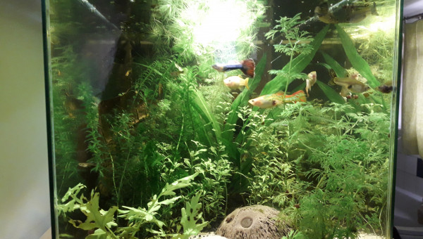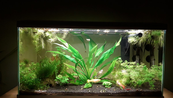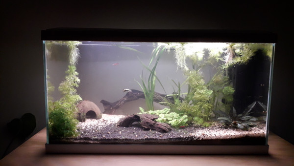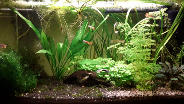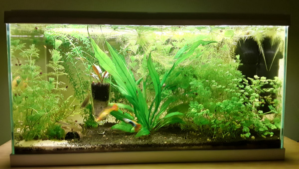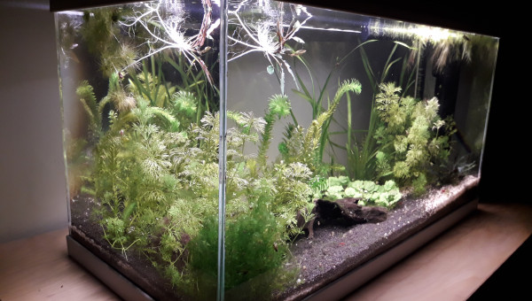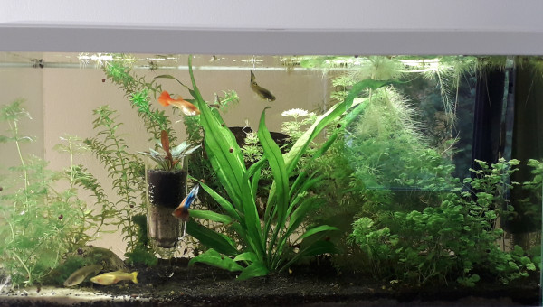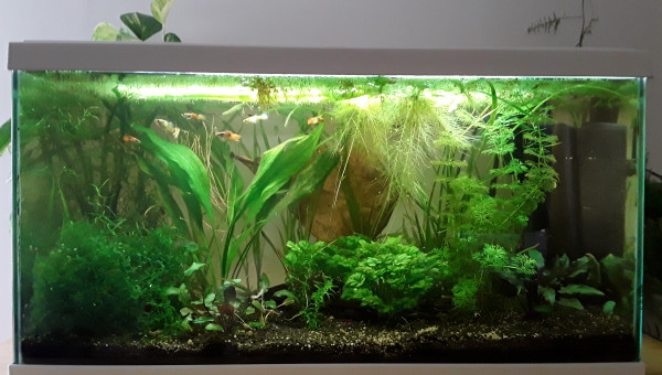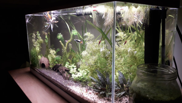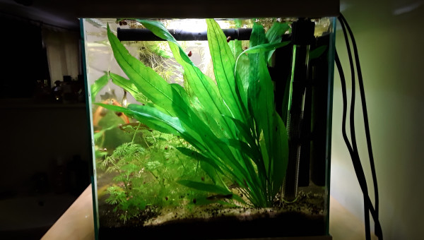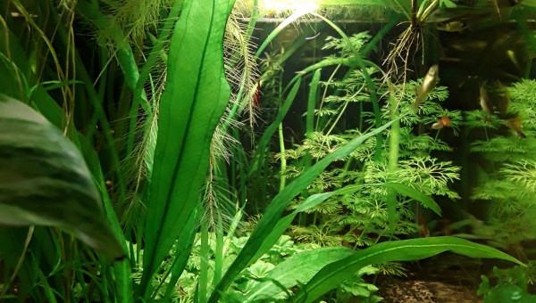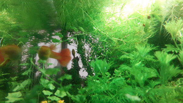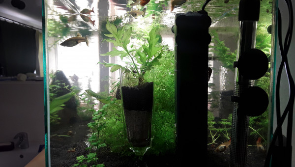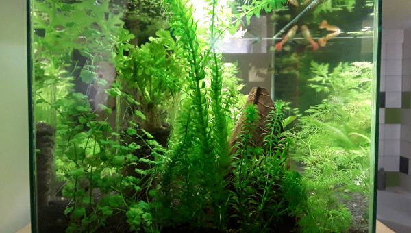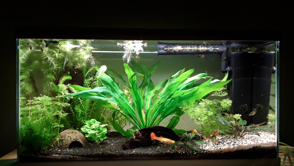 Suite à une invasion d'hydres (dont je n'arrive pas à savoir comment elles sont arrivées là... ) j'ai dû virer mon echinodorus il y a 3 jours. Une de mes guppynettes (rouge) est aussi arrivée au bout de sa vie. Un nettoyage minutieux, un gros changement d'eau et quelques petites plantations plus tard, je croise les doigts pour les hydres, je n en détecte plus depuis deux jours :)