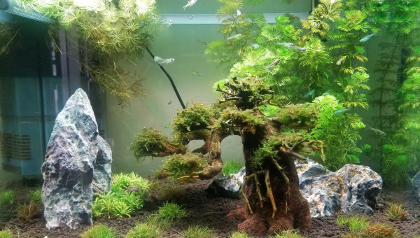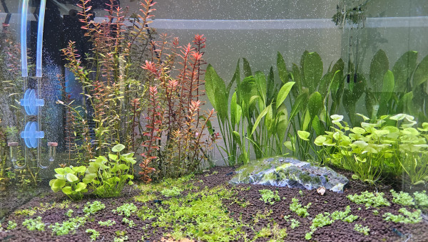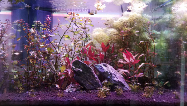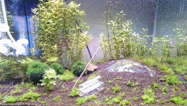 Insertions de nouvelles plantes et refonte totale de la conception visuelle du bac. Suppression du bonsaï. Ajout de roches au centre (seiru stone) Ont été conservées de la précédente configuration les Limnophila sessiflora uniquement. Ajout de : Ranunculus inundatus en avant plan Ludwigia super mini red sur les côtés Althernanthera rosanervig au centre derrière les roches