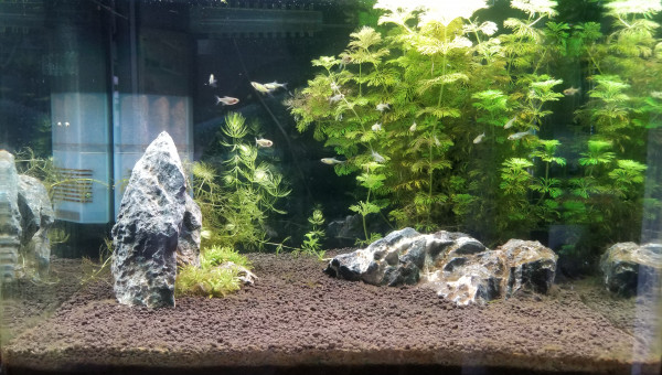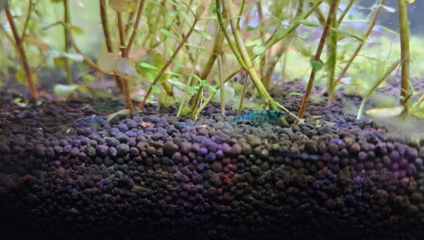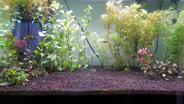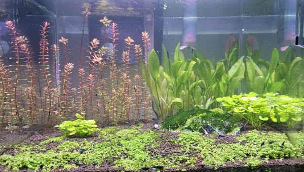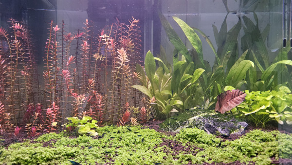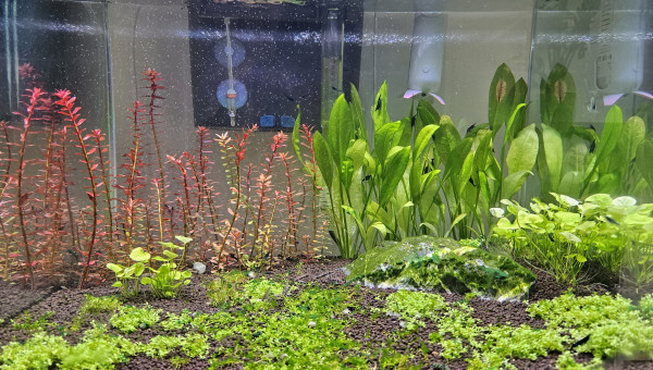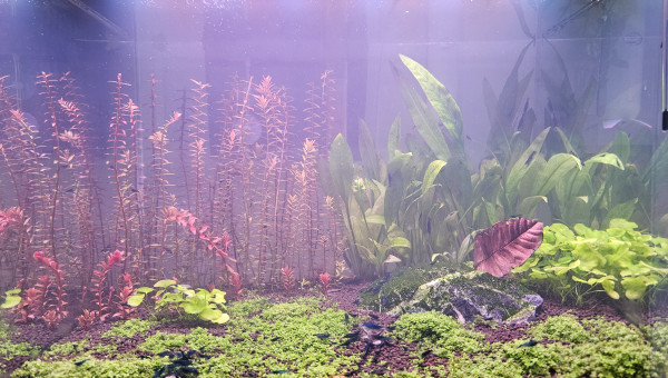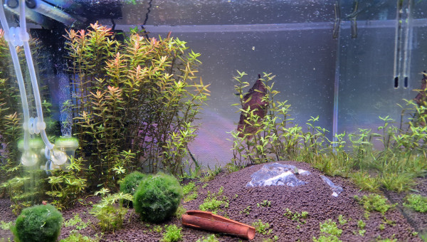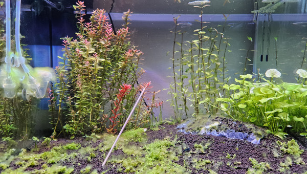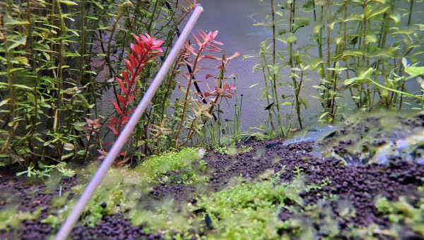Test et changement d'eau. La Limnophila a beaucoup poussé en une semaine, je l'ai donc taillée et j'ai replanté les boutures pour étendre le bouquet en place. La Cabomba est toujours en mauvais état, beaucoup de zones sont mortes, j'ai donc siphonné les têtes mortes pour éviter toute complication, il reste donc pas mal de tiges uniquement mais j'ai bon espoir qu'elle peut reprendre.