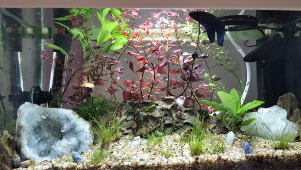 Georges a fait un magnifique nid de bulles il y a trois jours ; je lui ai proposé la femelle du bac communautaire. Quelques œufs ont été pondus (j'en ai vu tomber 6-7), mais je crois mangés par la femelle qui s'est jetée dessus. Georges n'est pas très douée, et elle est patiente.