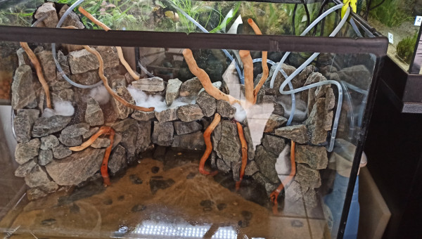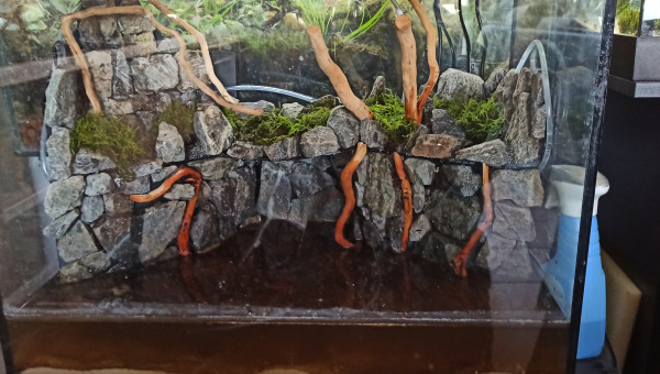 Le Betta étant d'un tempérament plutôt calme, j'envisage de placer 5 ou 6 écrevisses d'au moins 1 cm dans le bac. Avec les parois en pierres, elles devraient avoir largement assez de cachettes pour les mues. Elles n'auront pas accès à l'arrière du décor. La partie gauche est comblée avec des billes d'argiles et la partie droite (local technique) est entièrement fermée avec des fenêtres équipées de grillages à mailles très fines, je doute qu'elles puissent passer au travers.