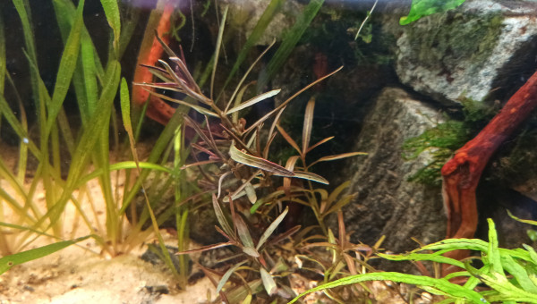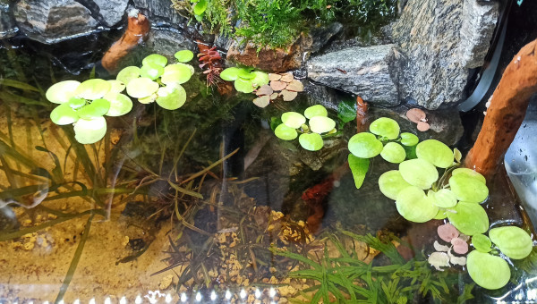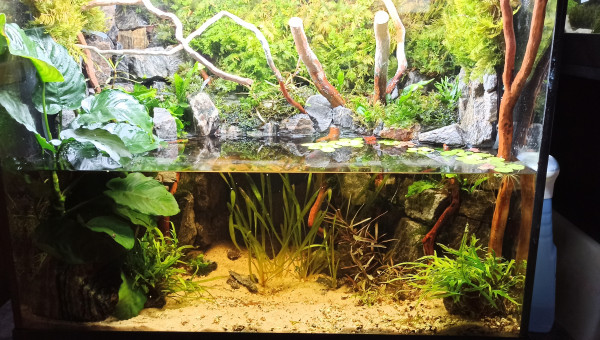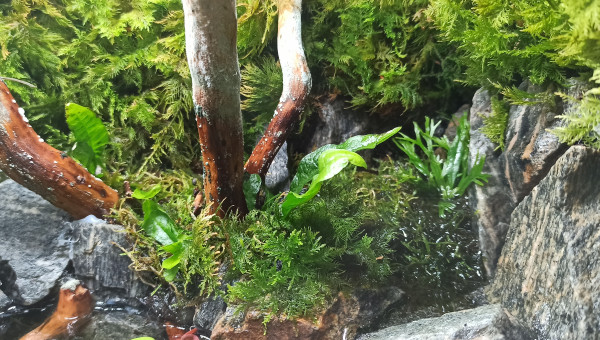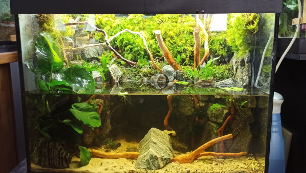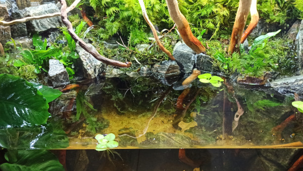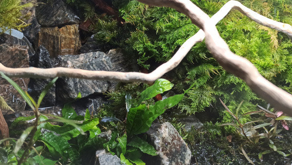 Bac vidé en partie pour sa maintenance. Les mousses ont colonisé les morceaux de bois. Les Hygrophila Lancea fleurissent à intervalles réguliers et les Vallisneria ont envahi une bonne partie de la zone aquatique. Taille des mousses et des Hygrophila (replantées direct), élimination d'une partie des racines des Microsorum plus coupe de quelques feuilles qui occultent trop la lumière. Le bac va bientôt être mis à la place du 60L Diminutus et céder sa place au 100L Diminutus en cours de montage. Question : où vais-je bien pouvoir mettre le 60L Diminutus en attendant que le 100L soit opérationnel ?...
