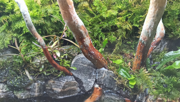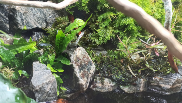 Ajout d'une partie de la végétation et habillage des terrasses. Pour les mousses en terrasses : Taïwan Moss, Riccardia, Rare Moss et Phoenix Moss. Au sol : Taïwan et Rare Moss et Anubias Nana. Sur la racine : Bucephalandra Velvet tricolor, B. Batang Waka, B. sp Mini-Red et B. Kedagang. Flottantes : Pistia Stratiotes. Un petit Ficus Pumila Variegata est planté en hauteur dans un mélange tourbe/terreau sur lit d'Aqualit. Le fond du "pot" trempe dans l'eau. Il manque les plantes du coin Manado : Deux Nymphoïdes, quelques petites cryptocorynes, quelques tiges d'hygrophila "Laos". Bref, un petit massif.