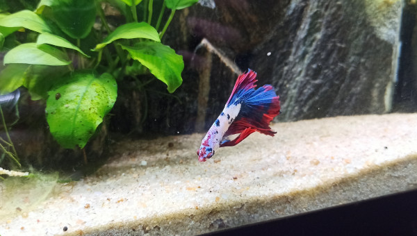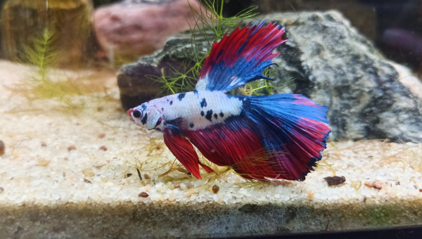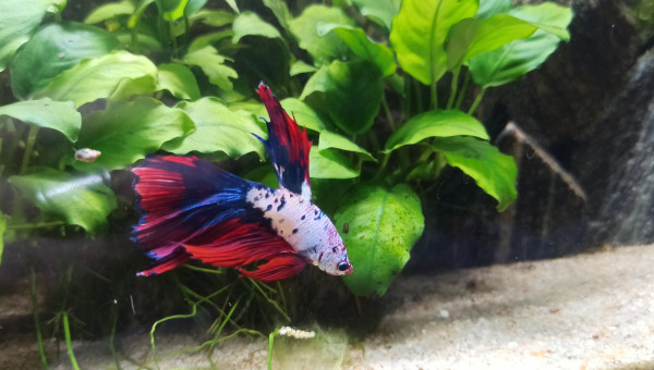 Le Betta rouge nous a quitté. Petit nettoyage du bac pour raison sanitaire, ce qui est un minimum, et un changement d'eau et une Fête des Mères plus loin, arrivé de "Blue Spot" un magnifique Superdelta Bleu électrique avec la caudale marginée de blanc.