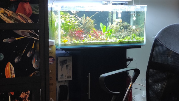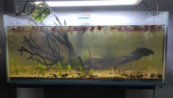-La cabomba qui n'est très certainement pas une furcata n'a cessé de péricliter depuis son introduction (quel que soit le bac, l'éclairage, le sol, la fertilisation). -La nymphoides hydrophylla a disparu. C'est entièrement de ma faute, je l'ai délaissé au profit d'autres végétaux. Je ne désespère pas, une pousse semble émerger de l'endroit où une tige esseulée a fait jusque-là office de vestige de la présence passé de cette plante. -La "monte-carlo" pousse mais ne se répand pas, la "wallichii" (en remplacement de la cabomba) et la "bullosa" nouvellements introduites semblent bien se porter pour l'instant quel que soit le bac. -La lobelia cardinalis et la lysimachia nummularia poussent lentement mais sûrement. J'aimerais idéalement les laisser émergés aux côtés des plantes en trempettes (sur l'arrière et à droite de celles-ci). Je suis donc malgré tout très satisfait de ce bac. Sous certaines conditions, le low tech offre un choix bien plus large qu'espérer en termes de plantes.