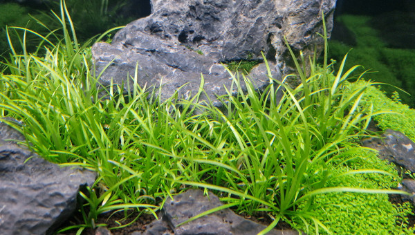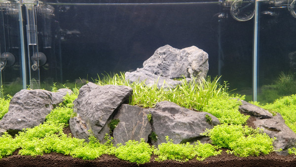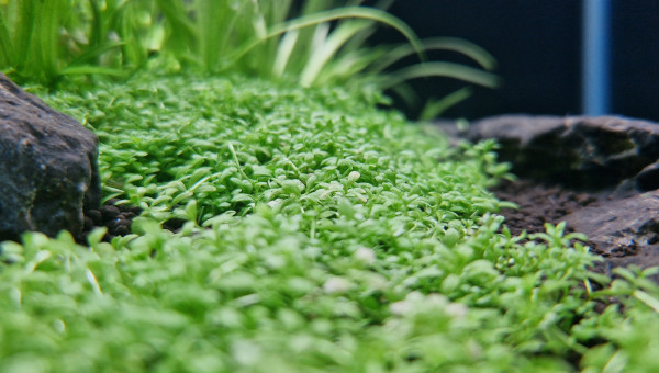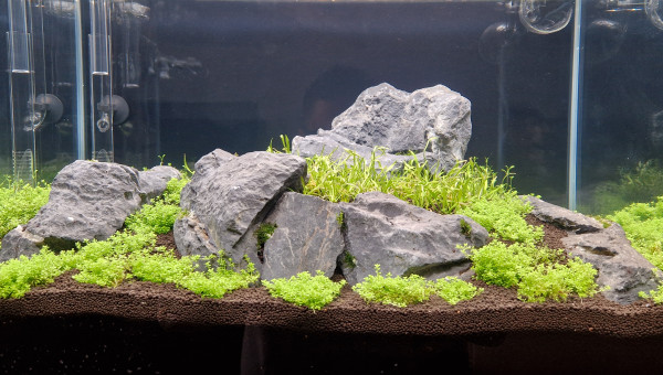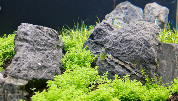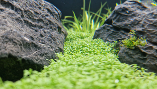 1ère Tonte après 4 semaines de mise en eau. Un peu d'engrais. 10 bulles de CO2 au lieu de 8. Un peu d'algues sur les caoutchouc des ventouses, sur les pierres (1cm d'algues vertes sur la grosse pierre du haut). Algues brunes très légères sur les autres. A nettoyer demain à la brosse à dent avant changement d'eau. Résultat top malgrés quelques feuilles jaunes (fertilisation en cours pour la 1ere semaine car manque de fer).