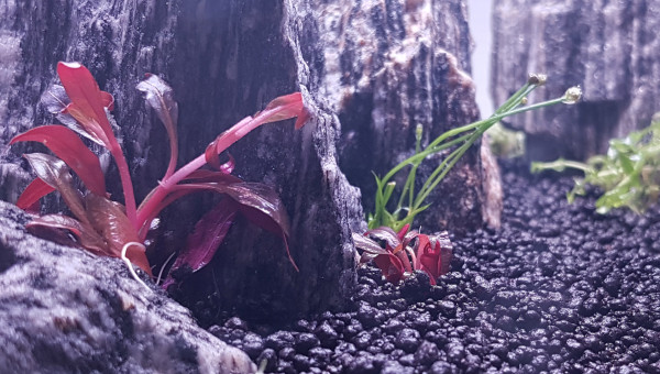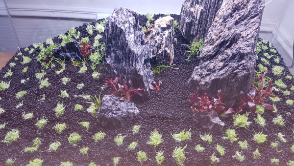 Pour les plantes j'ai pris 4 variétés toutes sont in-vitro pour éviter les indésirables : - Utricularia graminifolia (8 pots) comme plante gazonnante sur l'ensemble du bac, sauf le petit chemin qui restera en sol technique. - Gratiola viscidula (1 pot). J'ai pris un pot, mais j'en ai pas mis beaucoup. - Alternanthera reineckii Mini (1pot). J'adore cette plante, je trouve sa couleur rouge/pourpre/violet magnifique. - Eriocaulon cinerum (1pot) pour faire des petits buissons près des pierres.