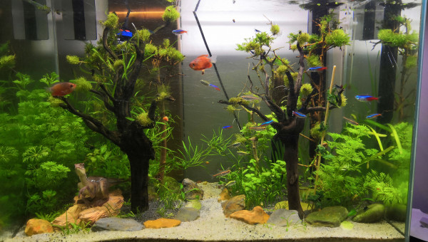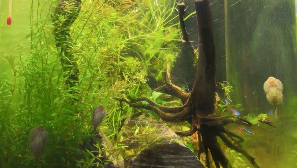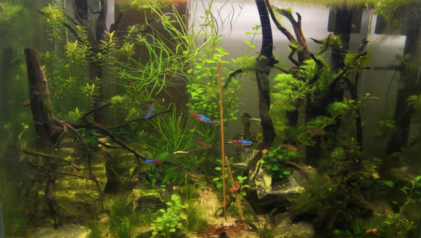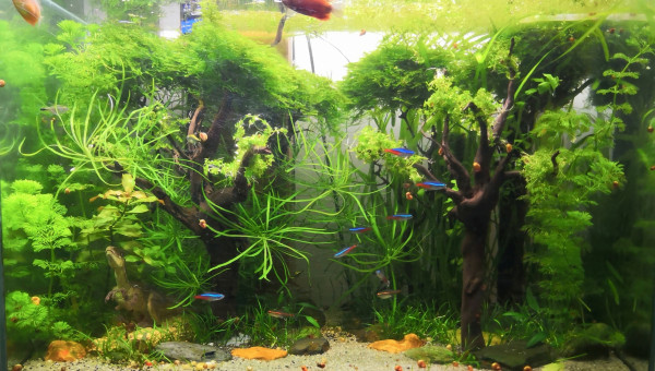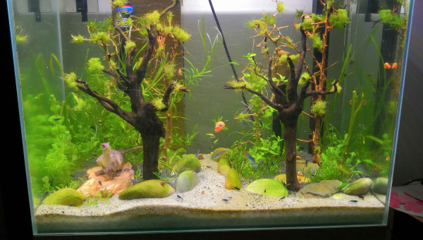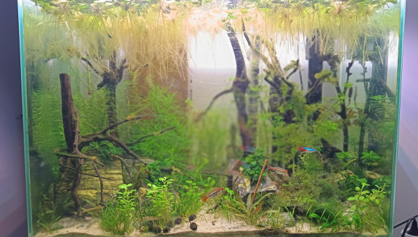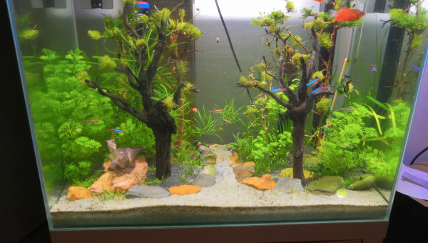Fluval F 60 85Litres Achat d'occasion, 3 ème main ayant déjà servi en nanorecifal, ce qui explique les nombreuses rayures sur la cuve. Aquarium pour les enfants. Décors prévu thème"forêt de jurassic world" ( de très bon goût, choisi par les enfants , on se moque pas svp ) Cuve percée. Population " communautaire" avec des vieux néons ( 3 ans en moyenne d'âge), des jeunes apistos issus de reproduction du 240l et des sewellias qui étaient là provisoirement et devaient intégrer le 120l mais mon fils s'est attaché à eux et ne veut pas les rendres aux adultes !