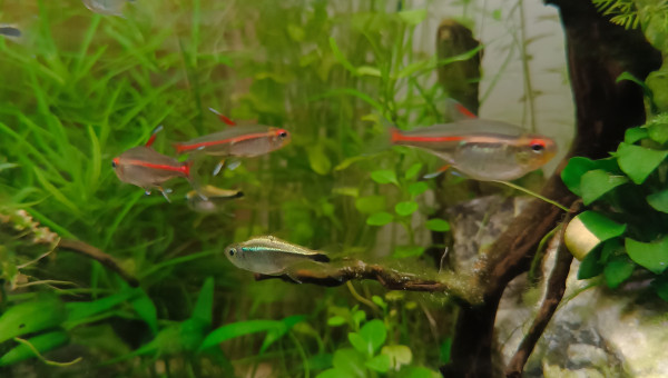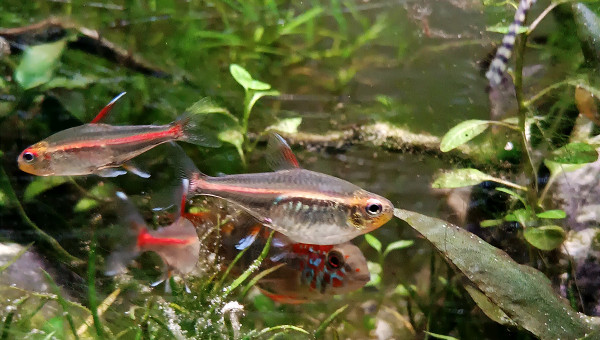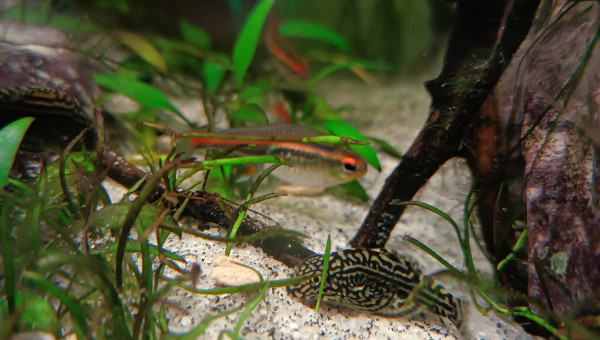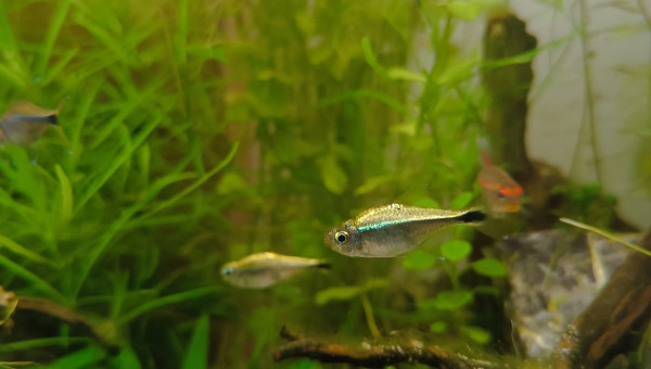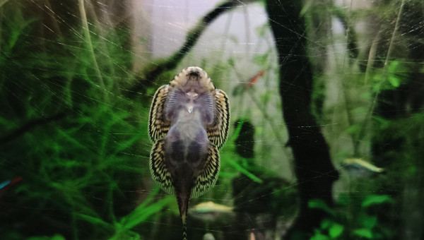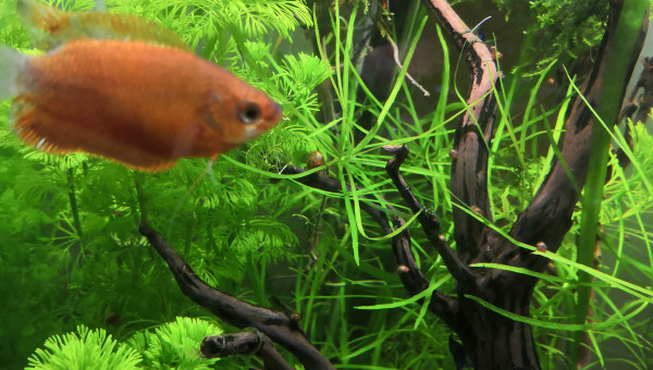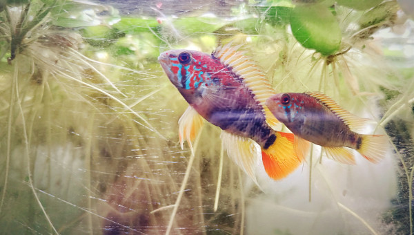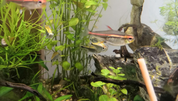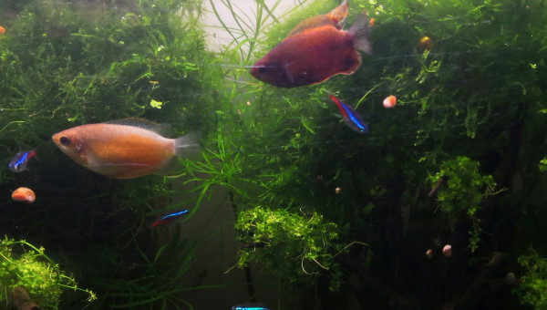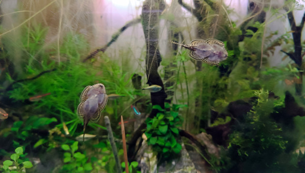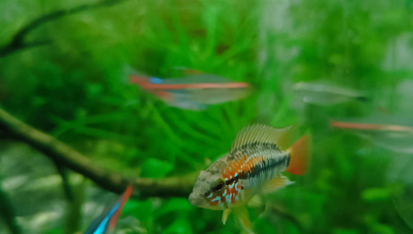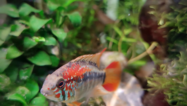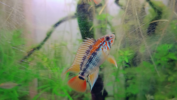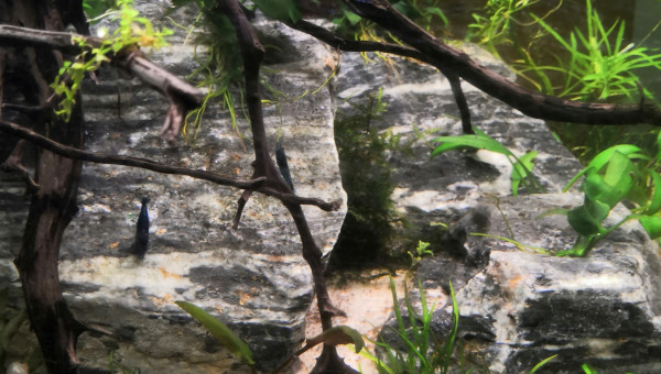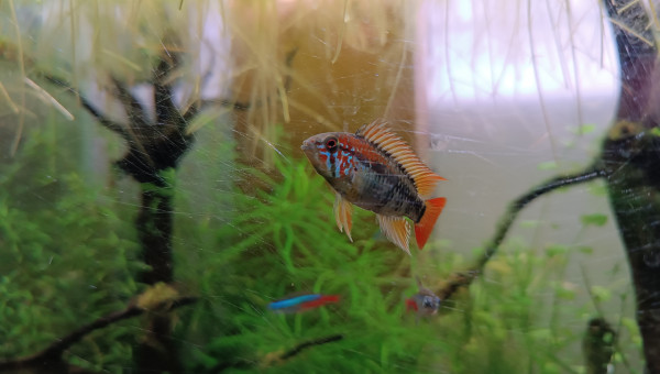 De retour du pique nique avec des membres du groupe aquario Facebook... 2 bassines de plantes données et ...craquage pour 2 louloutes. A l'introduction dans le communautaire des juniors ... mon mâle apisto s'est choisi une des femelles et lui fait une parade d'amour.... et sort un alevin Tetra doré de derrière les fourrés ! ??