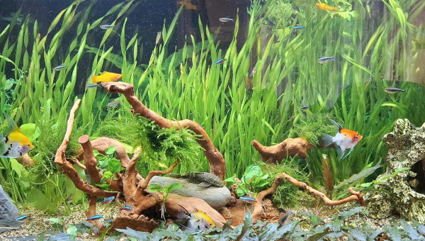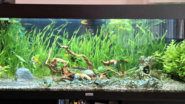 Biotope type amazonien avec des corydoras, ancistrus, néons noirs, néons roses, néons cardinalis, scalaires Koi ... Escargots planorbes. Plantes : vallisnéries, hygrophilas, crytocorines, cératoptéris, mousse ...
