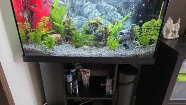 Aquarium de 110 litres en décoration. Placer pour me femme et ma fille de 12ans qui en voulait un comme cadeau d'anniversaire.... ce qui est fait.... Maintenant le remplir de décoration en plantes et poissons.