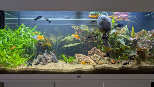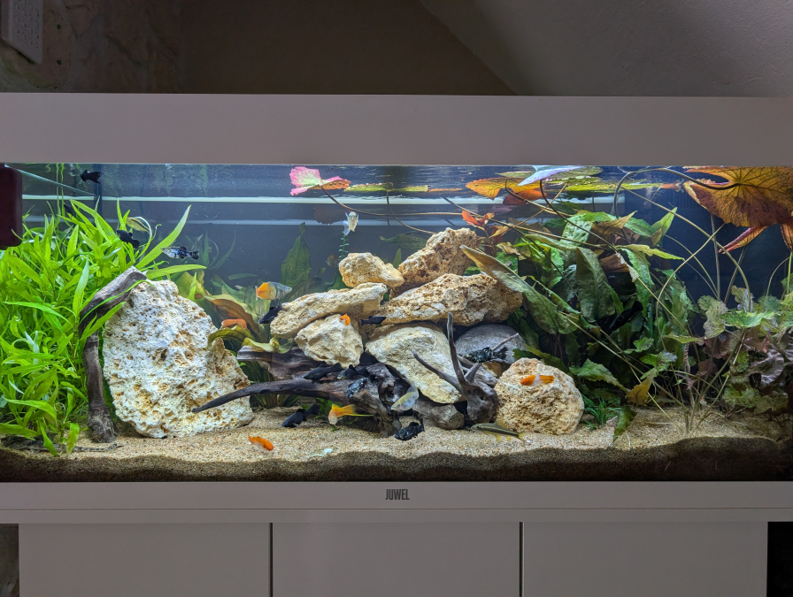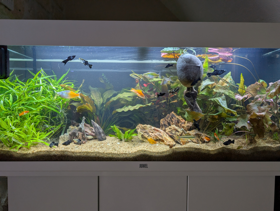 Aquarium communautaire en eau douce. Volume brut d’environ 207 L (101×41×50 cm). Volume net : 180 L. Mis en eau le 28 octobre 2020. Points notables : pierres, racines. Propriétaire basé à Longpont-sur-Orge.