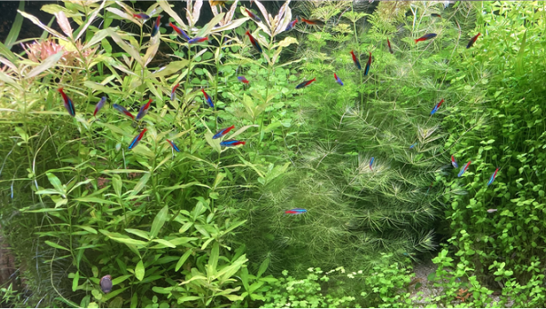 Depuis mon retour de vacances, l'absence de changements d'eau et de fertilisation ont profité aux algues vertes filamenteuses qui se sont développées de façon exponentielle. Pour les éradiquer, j'ai mis en place un plan d'action drastique, à savoir : Nettoyage des filtres et remplacement partiel des masses ceci afin de conserver un maximum de bactéries dénitrifiantes, siphonnages et changements d'eau à raison de 150 litres sur une semaine, introduction d'un gros bouquet de ceratophylum demersum, plante réputée pour consommer entre autres les nitrates et autres composés azotés responsables de la prolifération de toutes formes d'algues, fertilisation quotidienne à l'aide d'un engrais complet destiné à couvrir les besoins nutritionnels des plantes. Retrait manuel des algues et élagage des tiges des plantes infestées. Ces mesures devraient, je l'espère, me permettre d'éradiquer les algues et optimiser la repousse des plantes élaguées.