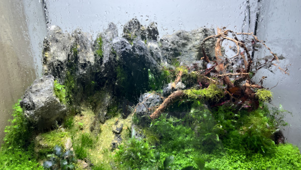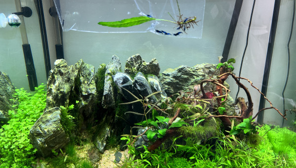 Aquarium lancé début avril 2023 en dry start. Je plante de l’hemiantus calitricoides cuba (hcc pr les intimes), de l’hydrocotyle et de la mousse de Java sur les roches et racines. Tout prend et s’étend très vite. J’arrose une à deux fois par jour avec de l’eau osmosée.