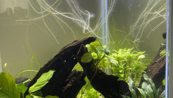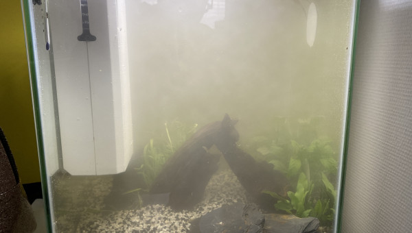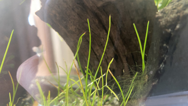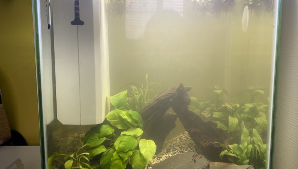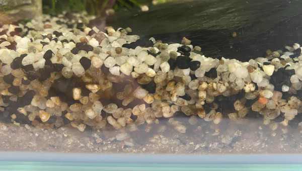 Le premier bac d’Alix (8 ans) avec du substrat, du sable blanc et noir, des pierres grises et deux racines. Ce bac accueillera des guppys, des crevettes et des escargots.