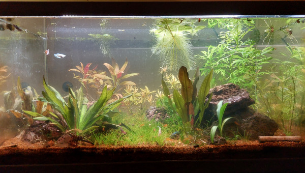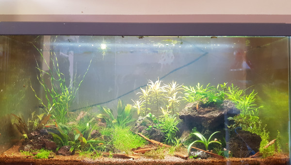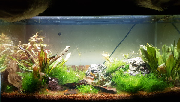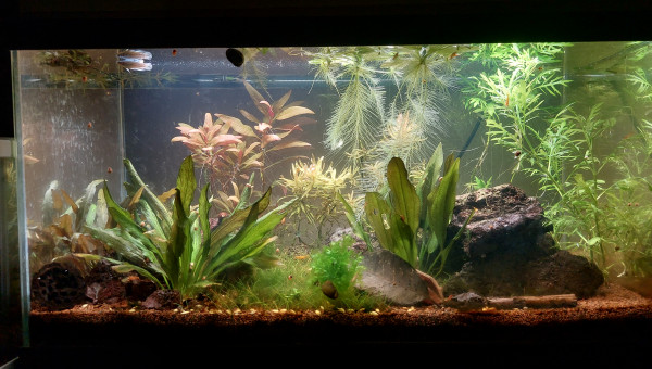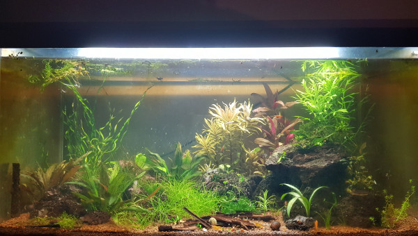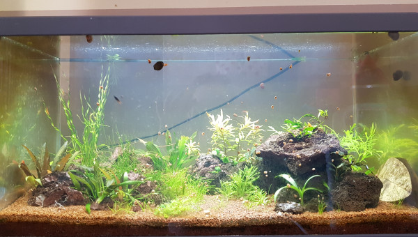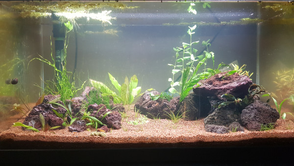 Aquarium avec un sol manado, des Roches volcaniques et de plantes Il accueil des crevettes sakura orange.