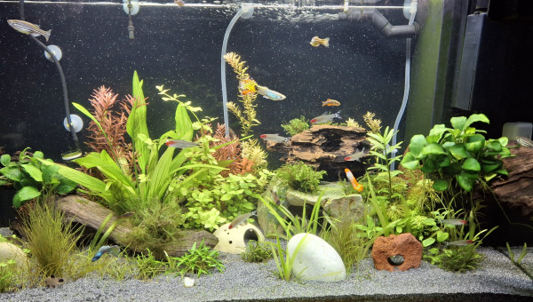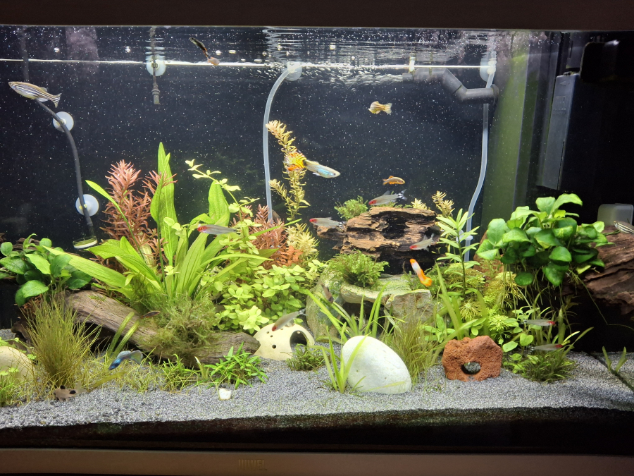 1er bac de la maison, nous voulions un bac communautaire paisible où chacun trouve sa place sans jouer des coudes. Avec de belles plantes rouge pour nos galaxy qui adorent les rotalas.