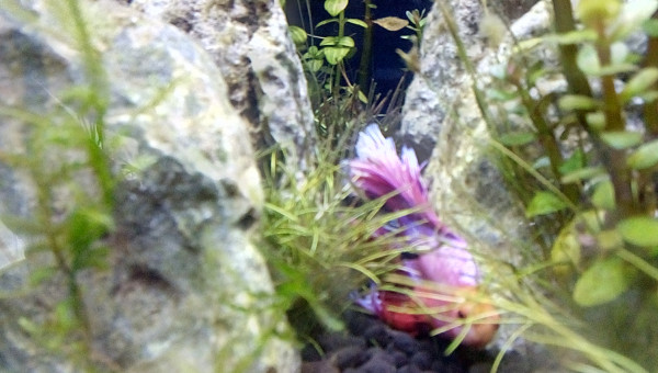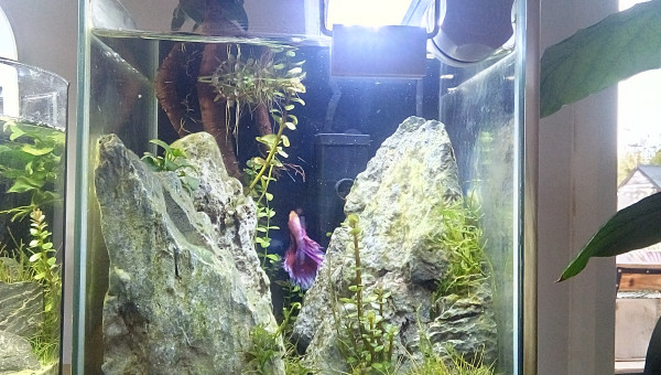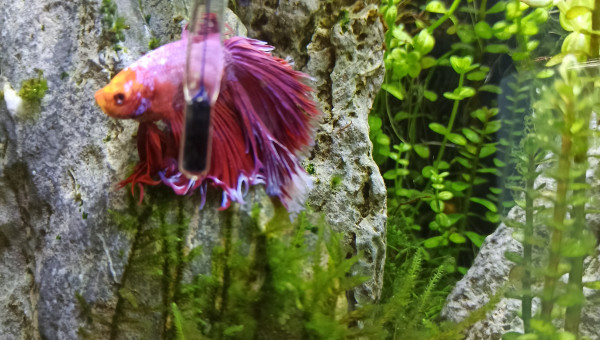 Betta Halfmoon, queue peigne/combtail lavander Craintif(peu domestiqué, ne vient pas à la demande, souvent caché), petit appétit, bagarreur, abandonne la chasse des proies d'1cm.