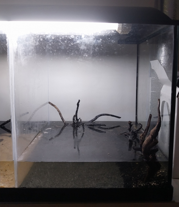 Bac de 60L divisé en 2 par une separation de verre fixé par des joints pour aquarium. La partie droite " Le monde de Bebou" accueillera apres cyclage un trio ou quatuor de Epiplatys Annulatus (Killie Clown) Ratio 1 male + femelles