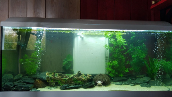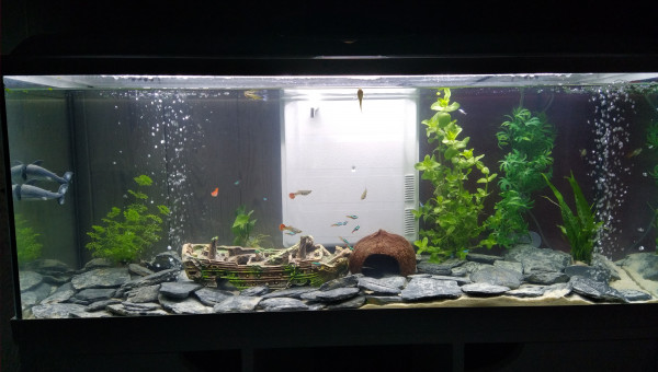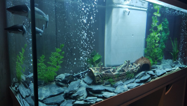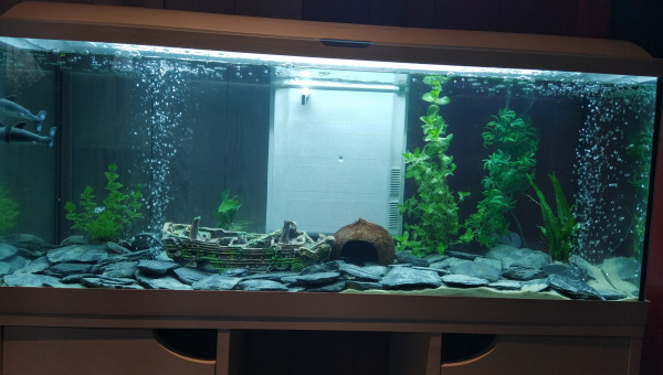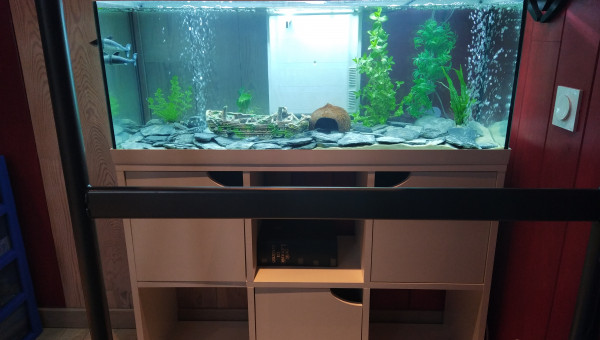 Voilà notre petit aquarium de 100 litres. Quelques plantes vivantes dons une anubia barteri et un bacopa monnieri, 6 herbes plastiques avec ventouses pour cacher les câbles qui descendent derrière, 2 diffuseurs branchés sur un buleur, sable fin au sol recouvert d'ardoises, une épave, une demie noix de coco comme maison et des requins qui ont transpercé la vitre. Tout ça branché sur 2 programmateurs. Détails des habitants : 2 Axolotls 10 néons 9 guppys 6 corydoras 1 pleco