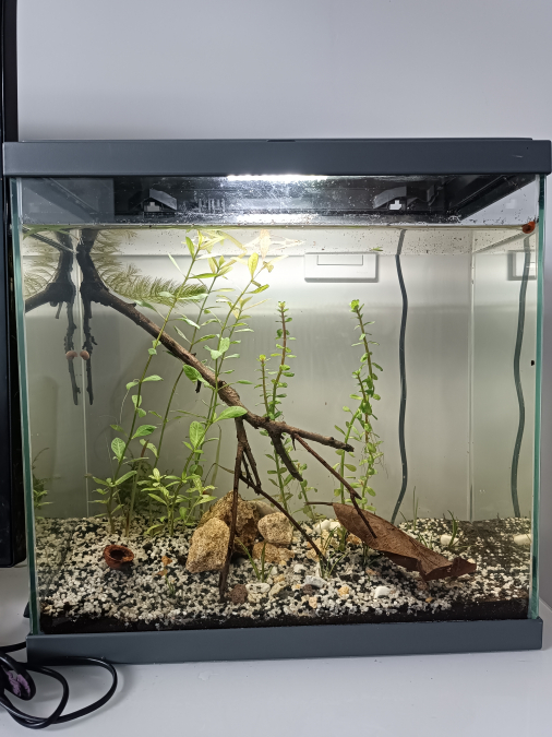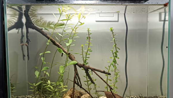 Un petit bac low-tech pour voir nager des crevettes un jour. En attendant, les plantes poussent et les escargots escargotent. On surveille les nitrites et nitrates.