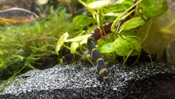 Tentative d'imiter un bord de rivière asiatique à faible courant avec un enrochement de galets et ardoises afin de faire plusieurs petites cavités. Plantes asiatiques (sauf une anubia lanceolata intruse) et population asiatique.